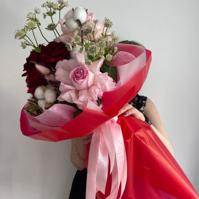 Букет с розами, хлопком и астронцией