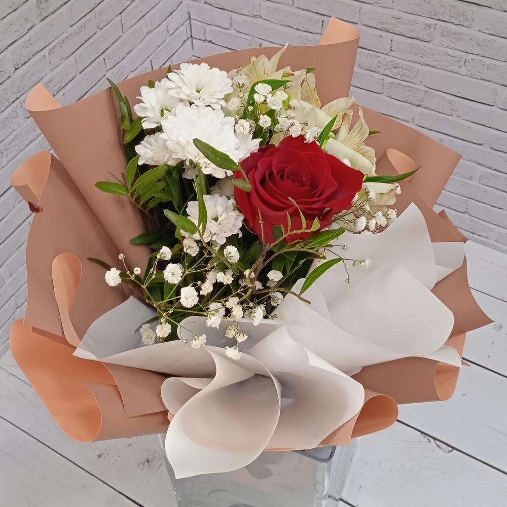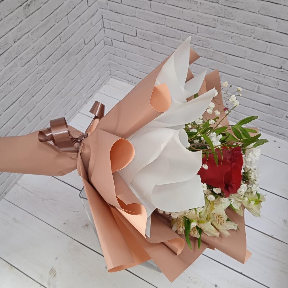 Роза Эквадор – 1 шт.Альстромерия – 1 шт.Сантини – 1 шт.Гипсофила – 1 шт.Рускус – 3 шт.Упаковка дизайнерская – 1 шт.