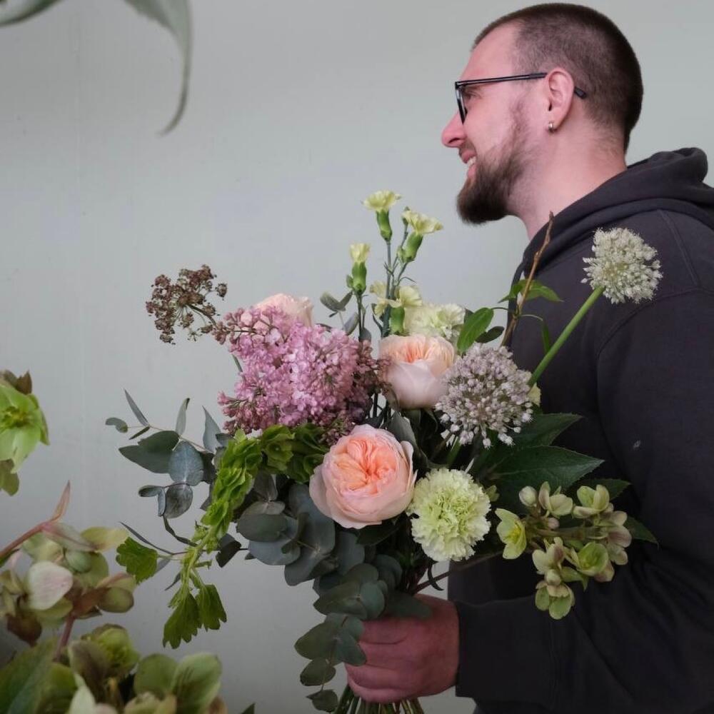 Лента – 1 шт.Сирень – 1 шт.Эвкалипт – 5 шт.Гвоздика – 1 шт.Гвоздика кустовая – 2 шт.Роза пионовидная – 3 шт.Ветка – 3 шт.Морозник – 1 шт.лук полевой – 2 шт.ирландский колокольчик – 1 шт.морковка полевая – 1 шт.