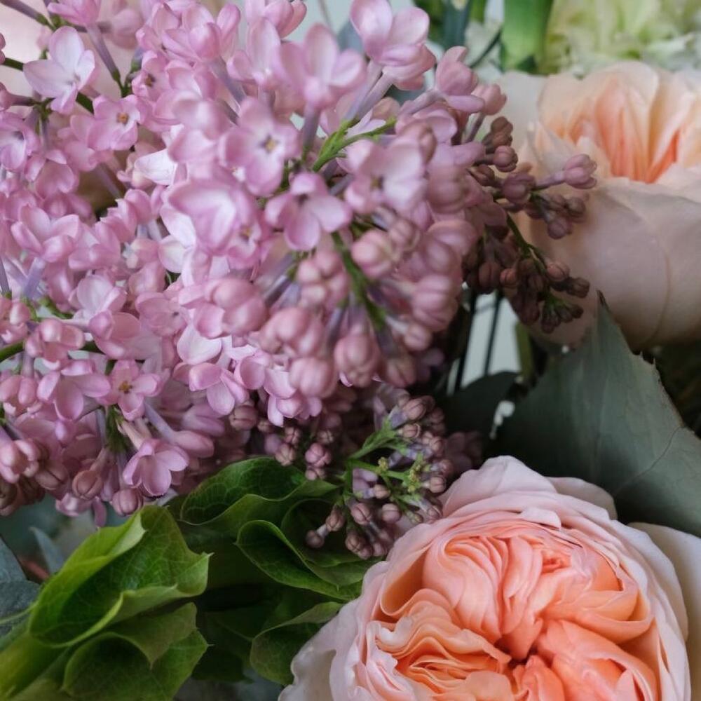 Букет с сиренью, луком и пионовидными розами