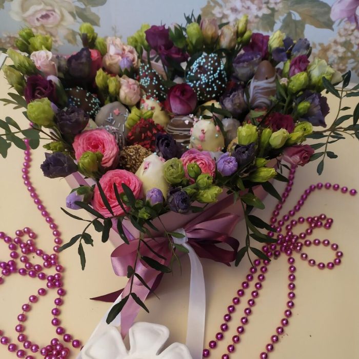 Роза кустовая – 2 шт.эустома фиолетовая – 3 шт.Упаковка дизайнерская – 1 шт.Коробка сердце – 1 шт.эустома розовая – 3 шт.Фисташка пучок – 2 шт.Клубника в шоколаде callebaut (бельгия) – 25 шт.Губка флористическая – 1 шт.ленты атласные – 3 шт.пленка траспортировочная – 1 шт.