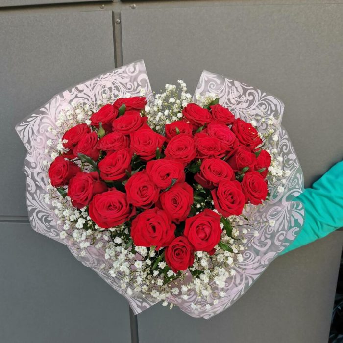 Красивый высокий букет из 31 красной крупной розы, собрано флористом в форме красивого сердца.