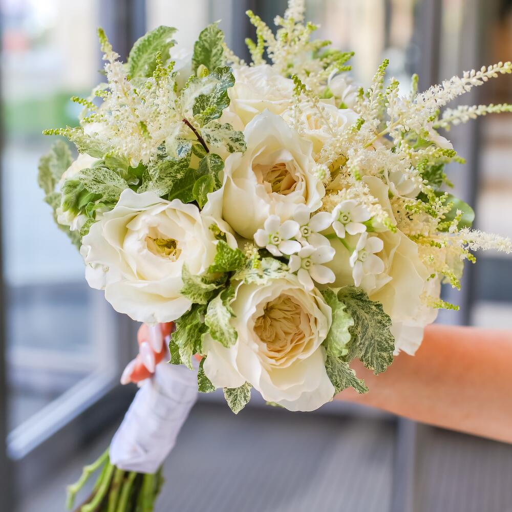 Питтоспорум – 3 шт.Лента атласная – 1 шт.Роза пионовидная – 13 шт.Астильба белая – 5 шт.оксипетамум белый – 5 шт.