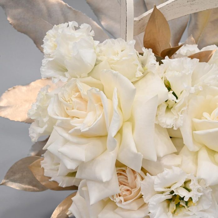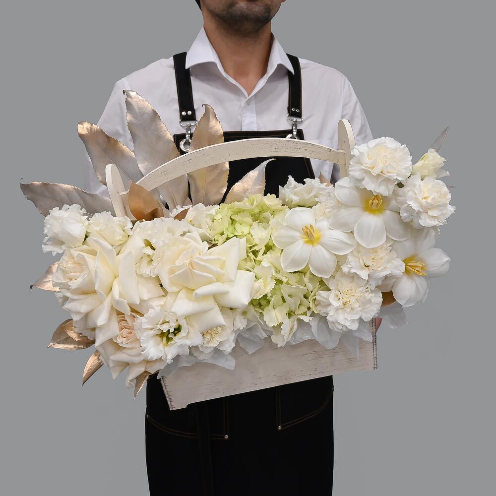 Французская роза – 3 шт.Эустома – 4 шт.Гвоздика – 7 шт.Тюльпан – 3 шт.Гортензия – 1 шт.Рускус – 5 шт.Аралия – 1 шт.Тишью – 2 шт.Ящик деревянный – 1 шт.