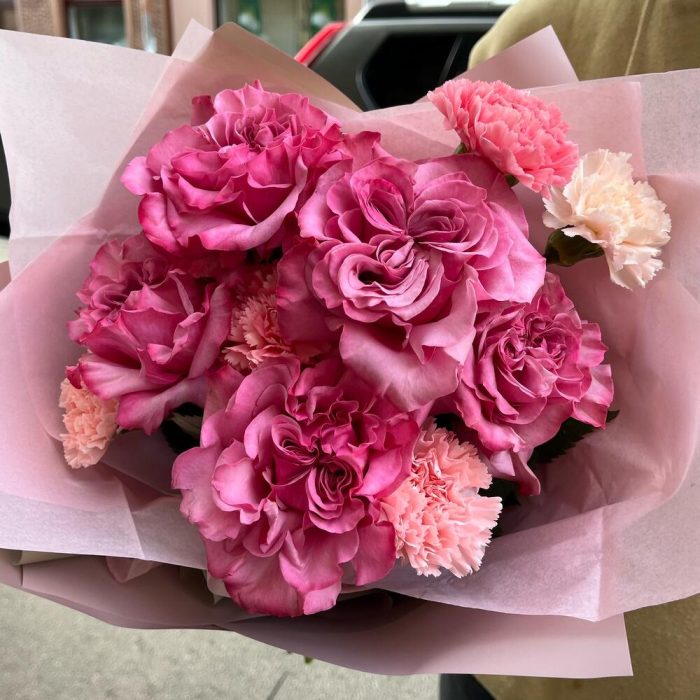 роза пионовидная кантри блю – 5 шт.диантус розовый микс – 6 шт.Упаковка дизайнерская – 2 шт.