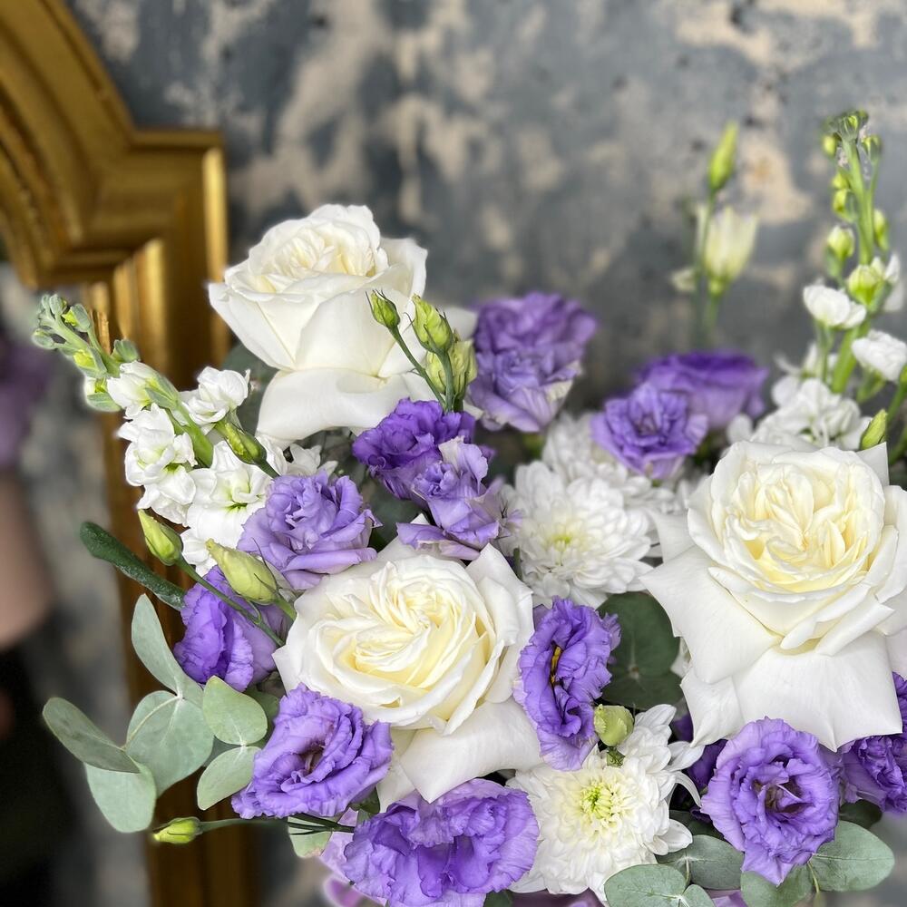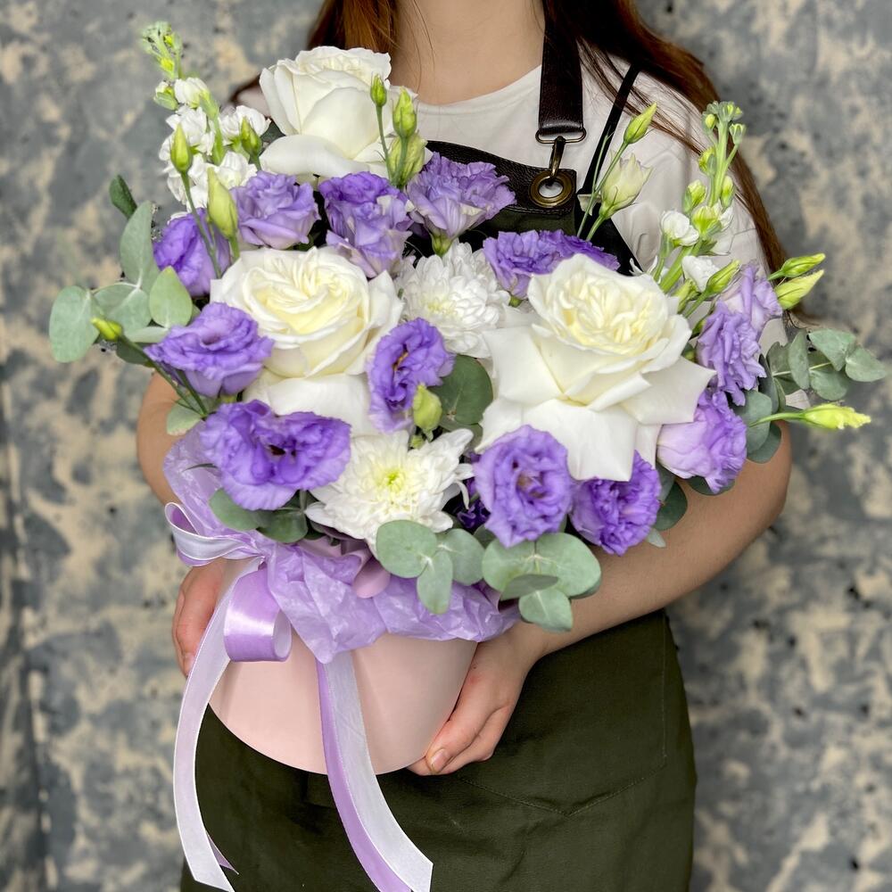роза пионовидная плайя бланка – 3 шт.Хризантема кустовая – 1 шт.эустома лавандовая – 3 шт.Маттиола – 2 шт.Эвкалипт – 3 шт.Оазис флористический – 1 шт.Тишью белое – 1 шт.Коробка шляпная – 1 шт.Лента атласная – 2 шт.