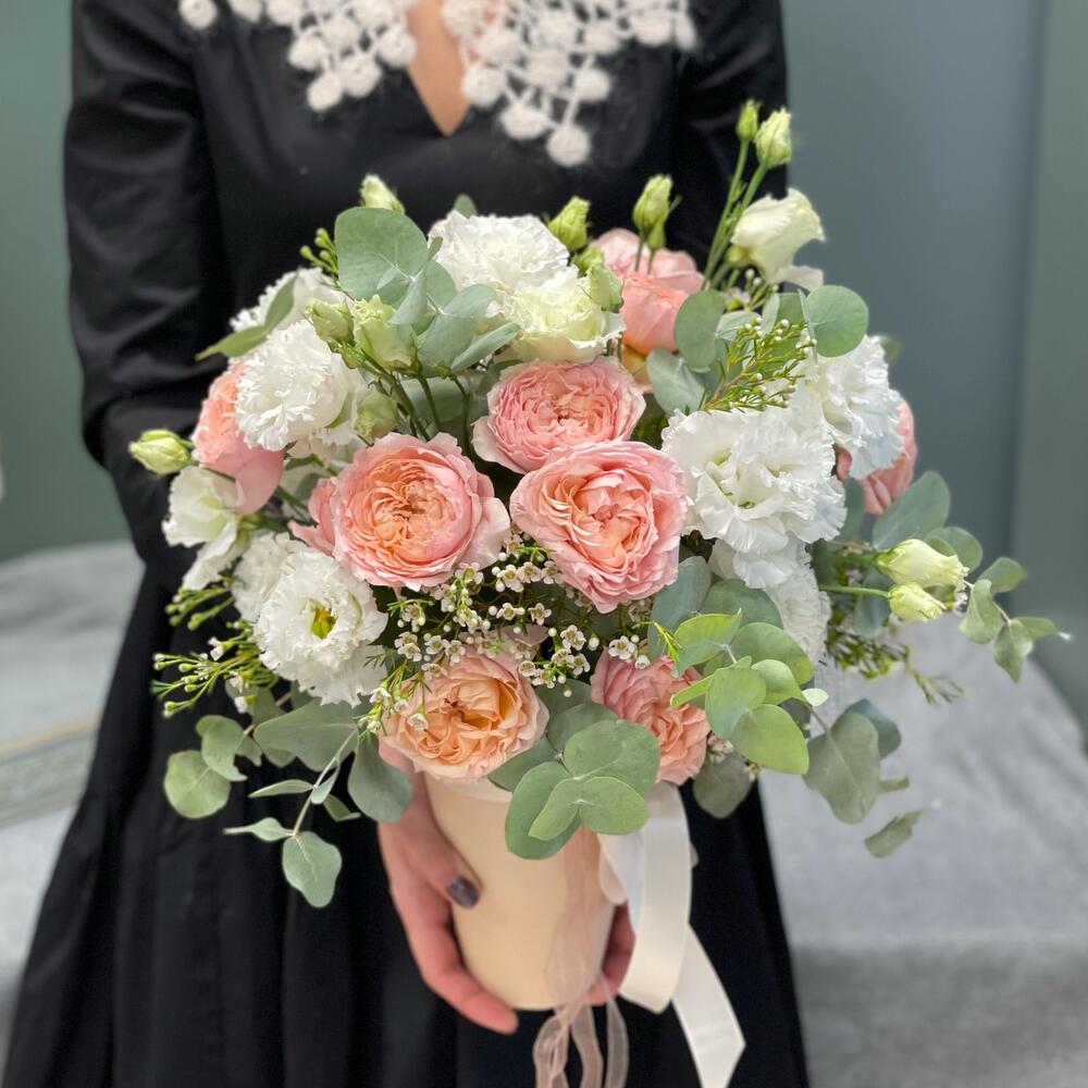 Эвкалипт – 2 шт.Лизиантус – 3 шт.Ваксфлауэр – 1 шт.Роза Джульетта – 3 шт.Коробка – 1 шт.Оазис флористический – 1 шт.