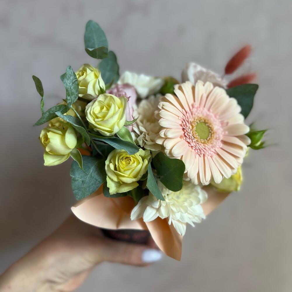 Стакан – 1 шт.Флористическая губка (оазис) – 1 шт.Гербера – 1 шт.Кустовая роза – 1 шт.Кустовая хризантема – 1 шт.Лизиантус – 1 шт.Эвкалипт – 1 шт.Лагурус – 3 шт.