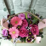 Цветы в большой коробке: садовые розы, лизиантус, маттиола, тюльпаны