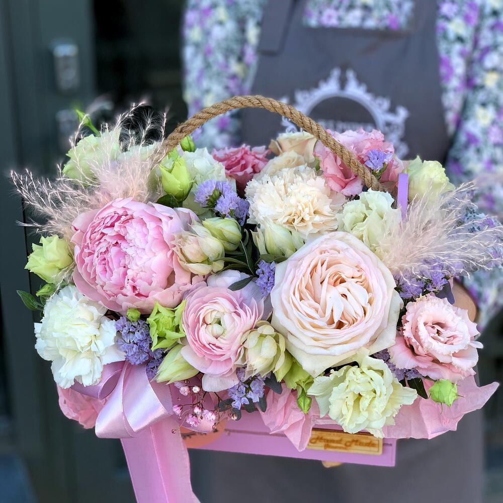 Цветы в коробке пионовидная роза,кустовая хризантема и эвкалипт