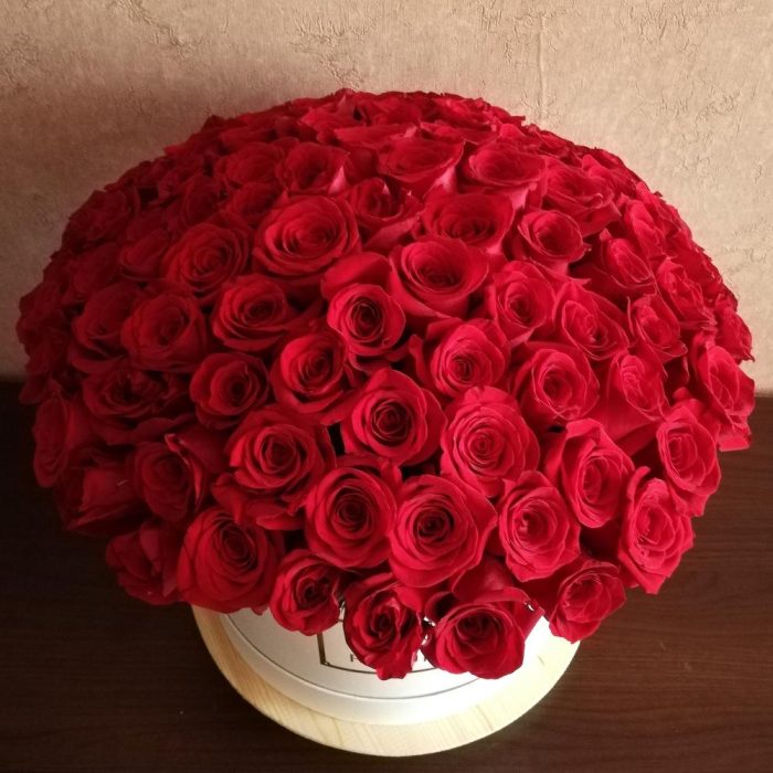 Роза – 101 шт. Коробка шляпная – 1 шт. Оазис флористический – 3 шт.