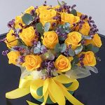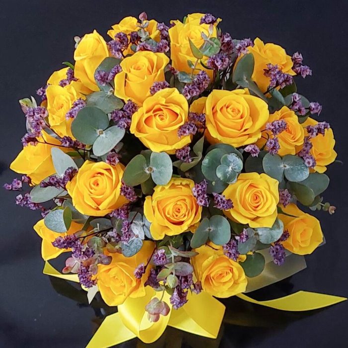 Роза желтая – 21 шт.Лента атласная – 2 шт.Коробка шляпная – 1 шт.Пленка матовая – 1 шт.Открыточка с вашими пожеланиями – 1 шт.Эвкалипт Baby Blue – 4 шт.лимониум стабилизированный – 3 шт.транспортировочная упаковка – 1 шт.