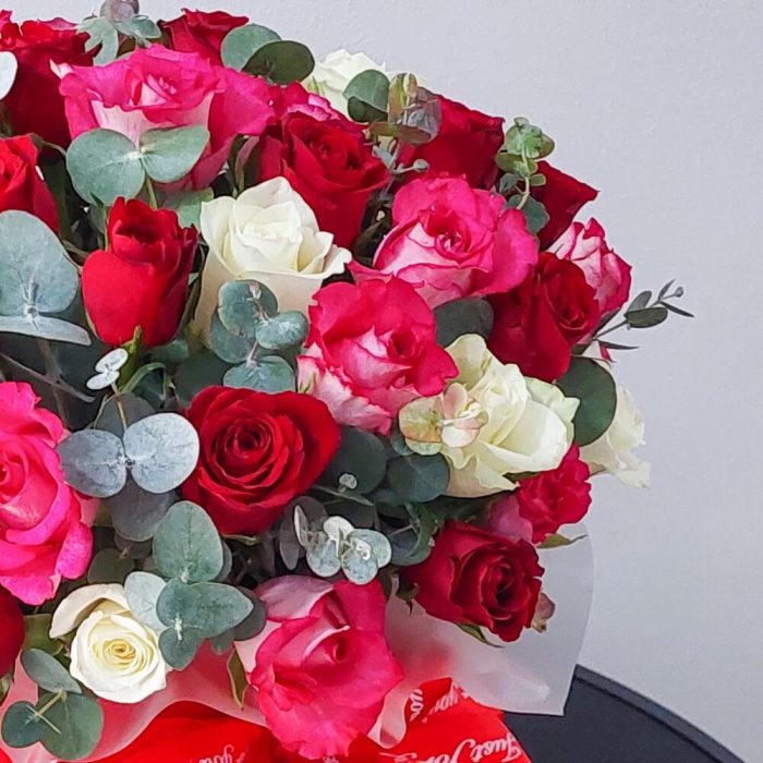 Лента атласная – 3 шт.Пленка матовая – 1 шт.Открыточка с вашими пожеланиями – 1 шт.Шляпная коробка большая – 1 шт.Оазис флористический – 2 шт.Эвкалипт Baby Blue – 9 шт.роза микс – 51 шт.транспортировочная упаковка – 1 шт.