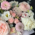 Цветы в коробке из пионовидных роз,Хризантемы и Гербер