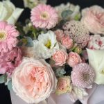 Пионовидная роза – 5 шт.Кустовая роза – 3 шт.Тюльпан пионовидный – 3 шт.Хризантема – 2 шт.Гербера – 3 шт.Лизиантус – 4 шт.Озотамнус – 2 шт.антиринум – 2 шт.Эвкалипт – 3 шт.Шляпная коробка – 1 шт.Флористическая губка (оазис) – 1 шт.Атласная лента – 1 шт.