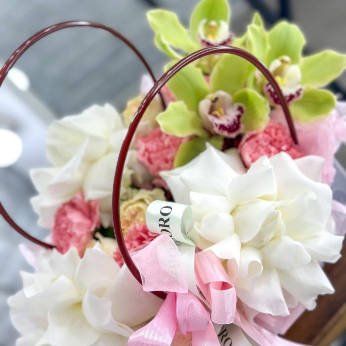 Орхидея Цимбидиум – 3 шт.Открыточка с вашими пожеланиями – 1 шт.Оазис флористический – 1 шт.Сумочка с ручками из плотного картона ламинированого – 1 шт.Диантус сортовой – 5 шт.роза садовая пионовидная – 3 шт.роза playa blanca – 3 шт.