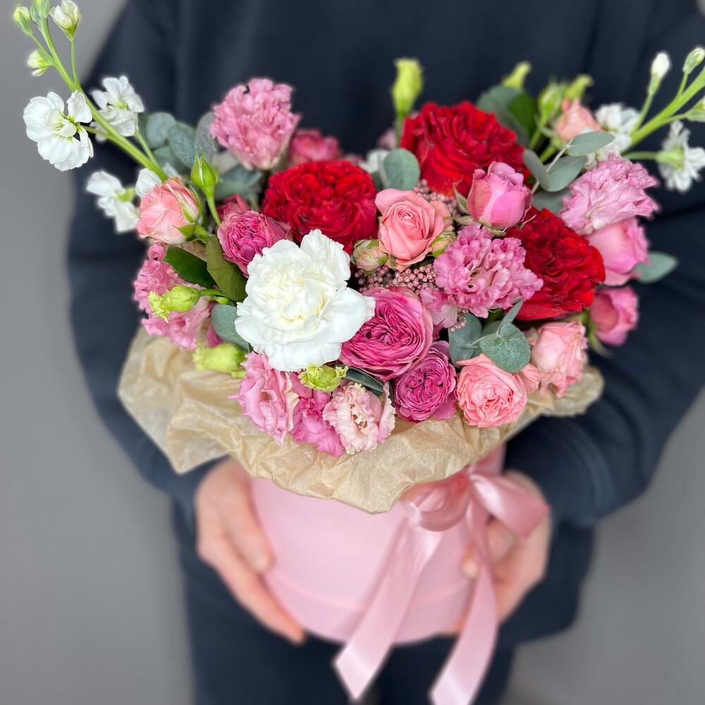 Цветочная композиция в шляпной коробке с красными пионовидными розами Инструкция по уходу за цветами:1. Поливайте композицию холодной водой не более чем 50-100 мл (только в центр композиции);2. Повторяйте процедуру каждые 2 дня;3. Берегите цветы от сквозняка и перепадов температур;4. Не оставляйте цветы рядом с фруктами. Дарите радость своим близким вместе с цветочной лавкой «Polyanka»