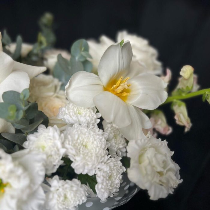 “Атлас☁️” – цветочная композиция с зефиром в деревянном ящике