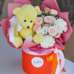 Цветы в яркой коробке с мишкой