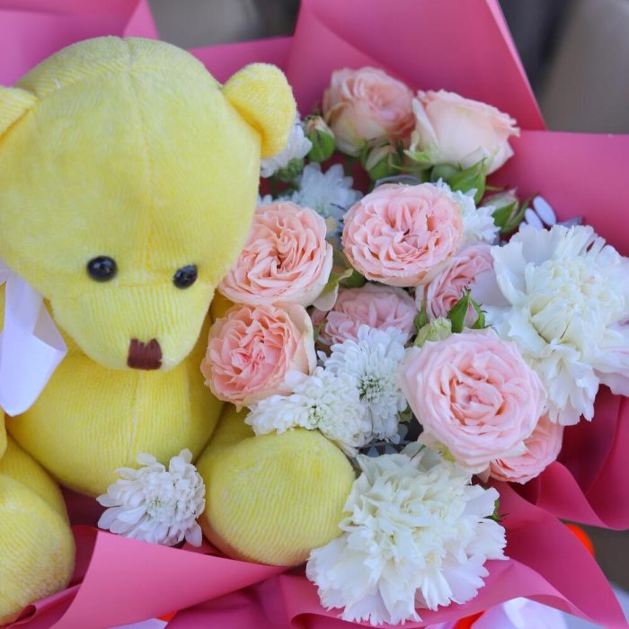 Яркая, насыщенная и воздушная композиция с мишкой, выполненная из стокйих цветов: кустовой розы, сантини и диантусов.Такая композиция точно понравится яркой и энергичной получательнице, и будет долго радовать её.К композиции прилагается открытка с вашими пожеланиями и приятный комплимент от нашего магазина – шоколадка.Мы также будем рады отправить вместе с композицией конфеты, шоколад ручной работы или б/а вино по вашим пожеланиям, просто напишите нам в личные сообщения. Заказывая нашу композицию, Вы всегда получите исключительный сервис и заботу о клиенте