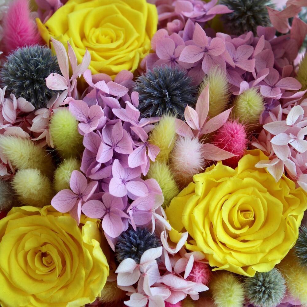 Роза одноголовая – 3 шт.Гортензия – 2 шт.пушистики – 1 шт.Деревянный ящик – 1 шт.