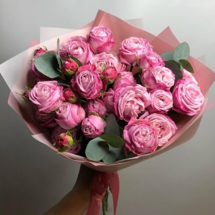 Пионовидная кустовая роза – 5 шт. Упаковка дизайнерская – 2 шт. Атласная лента – 1 шт. Открыточка с вашими пожеланиями – 1 шт.
