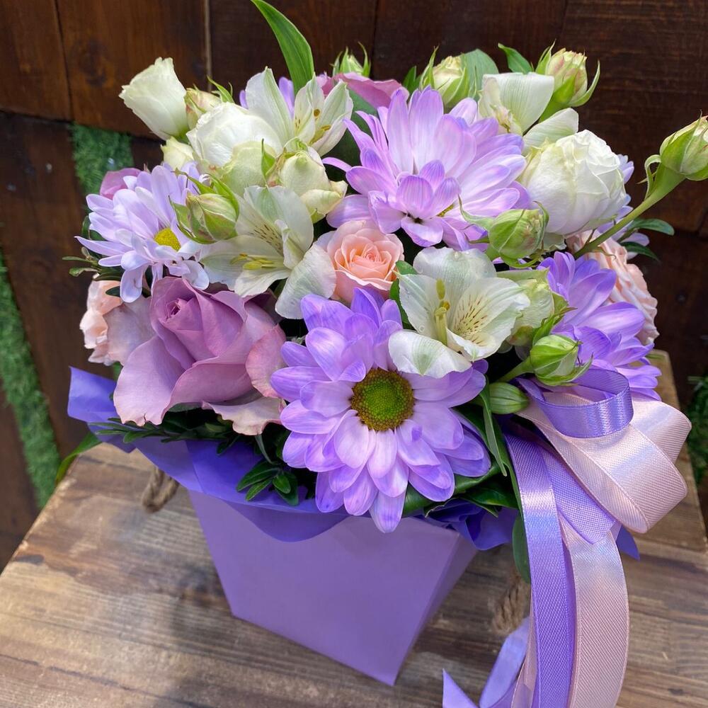 Роза – 3 шт.Хризантема кустовая – 1 шт.Альстромерия – 2 шт.Роза кустовая – 1 шт.Сумочка картонная – 1 шт.зелень декоративная – 5 шт.