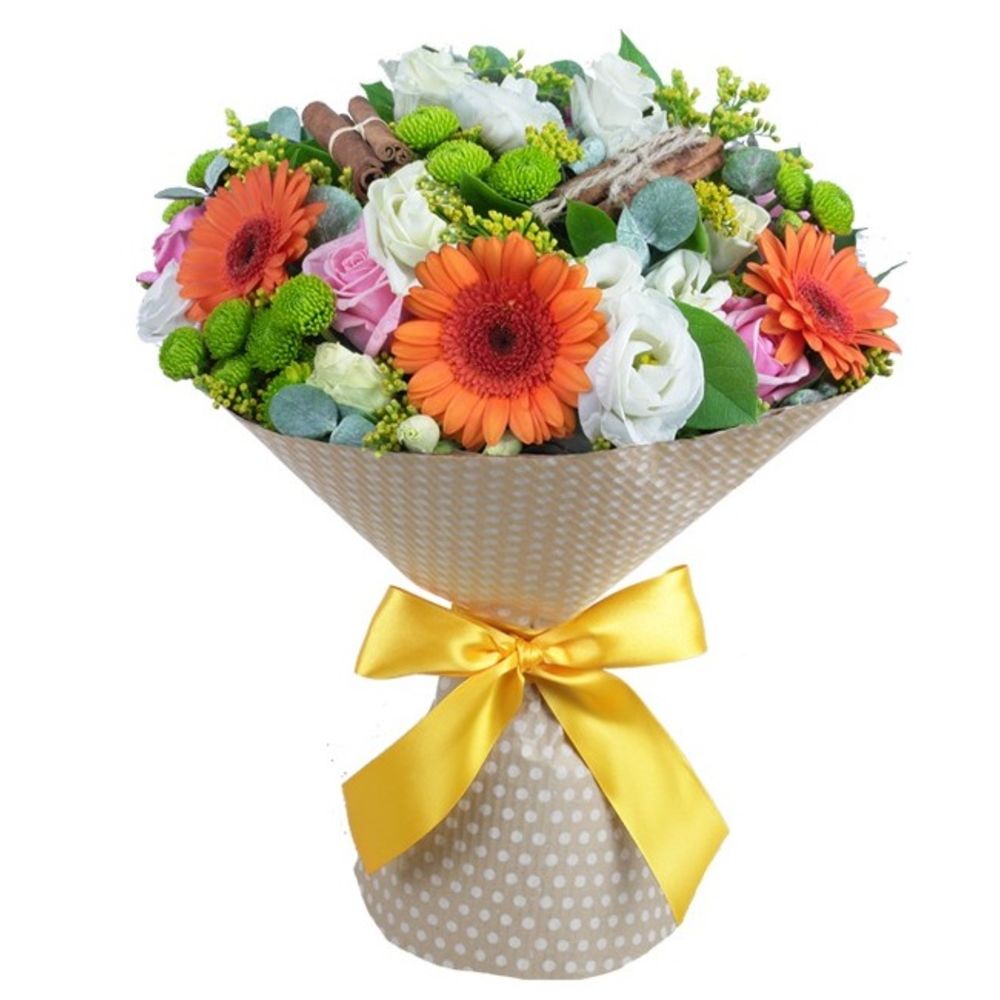 Хризантема сантини зеленая – 5 шт.Листья салал – 1 шт.Солидаго – 3 шт.Корица – 1 шт.лента декоративная – 1 шт.бумага упаковочная – 1 шт.Роза розовая – 5 шт.Эвкалипт – 1 шт.Гербера оранжевая – 5 шт.Лизиантус белый – 3 шт.