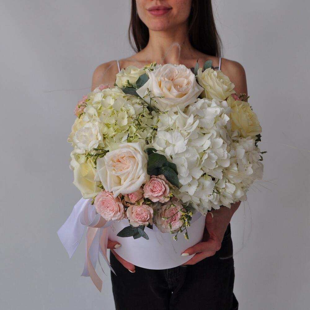 Гортензия и пионовидные розы Охара в большой коробке "Белоснежка"