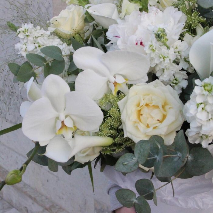 орхидея – 2 шт.Сирень – 5 шт.Роза – 9 шт.Львиный зев – 7 шт.Маттиола – 7 шт.Амми – 5 шт.Лизиантус – 4 шт.Паникум – 4 шт.Эвкалипт – 11 шт.Коробка шляпная – 1 шт.ленты атласные – 2 шт.
