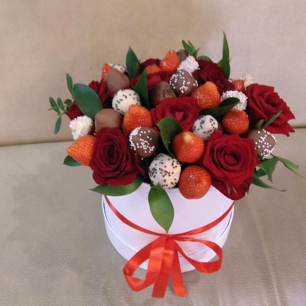 клубника в шоколада – 15 шт.Клубника (шт) – 10 шт.Роза красная 50 см – 9 шт.Коробка шляпная – 1 шт.Зелень – 1 шт.