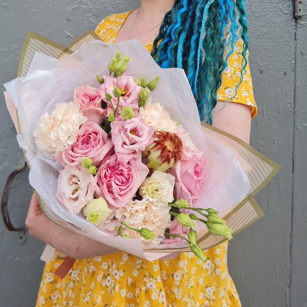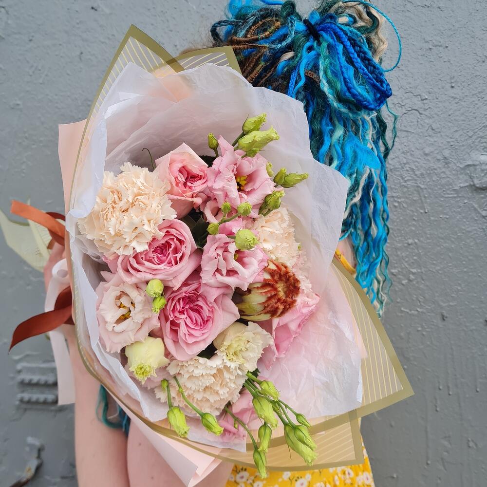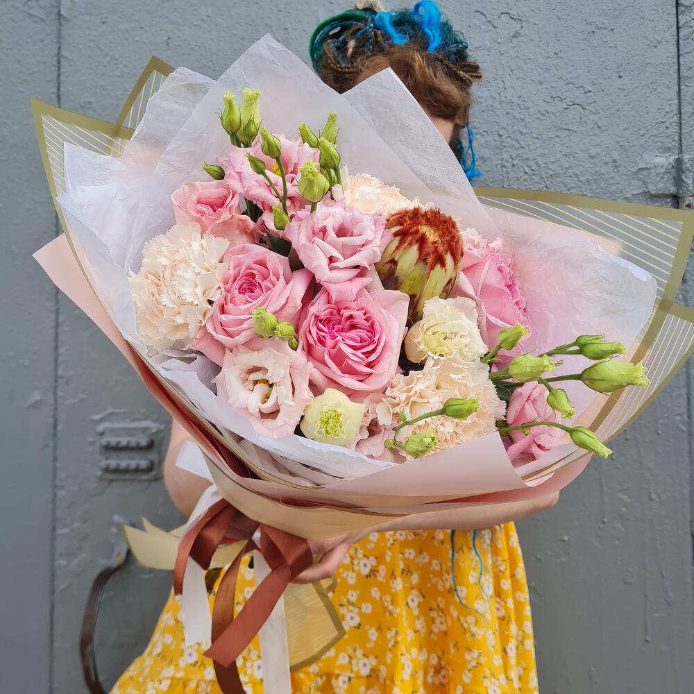 Протея – 1 шт.эустома махровая – 3 шт.Роза pink o’hara – 5 шт.Диантус сортовой – 3 шт.
