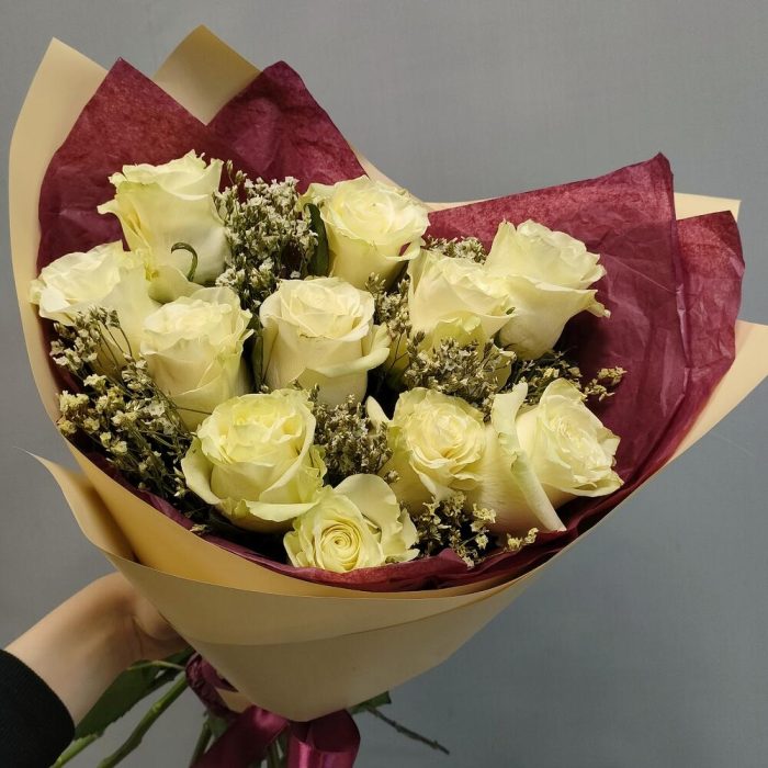 Роза Эквадор белая – 11 шт.Лимониум – 5 шт.Тишью – 2 шт.Пленка матовая – 1 шт.