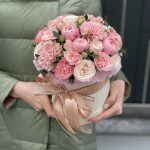 Коробка – 1 шт. Оазис – 1 шт. Кустовая роза – 5 шт. Эвкалипт – 2 шт. Гвоздика сортовая – 2 шт. Оформление – 1 шт.