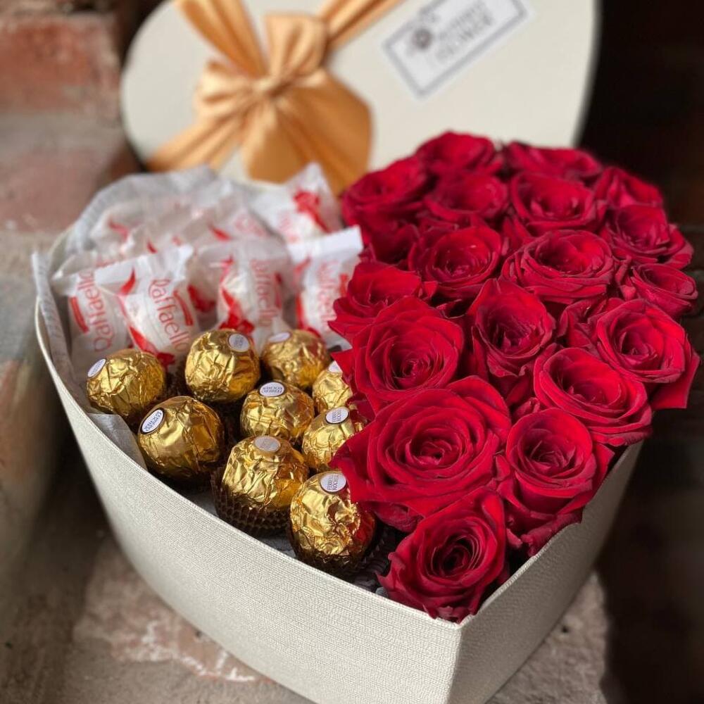 “Сладкое сердце ” – цветочная композиция с сладостями в коробке “Сердце”