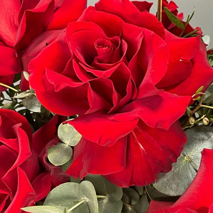 Лента – 1 шт.Эвкалипт – 2 шт.Роза одноголовая – 9 шт.Коробка шляпная – 1 шт.Фисташка – 2 шт.Оазис флористический – 1 шт.