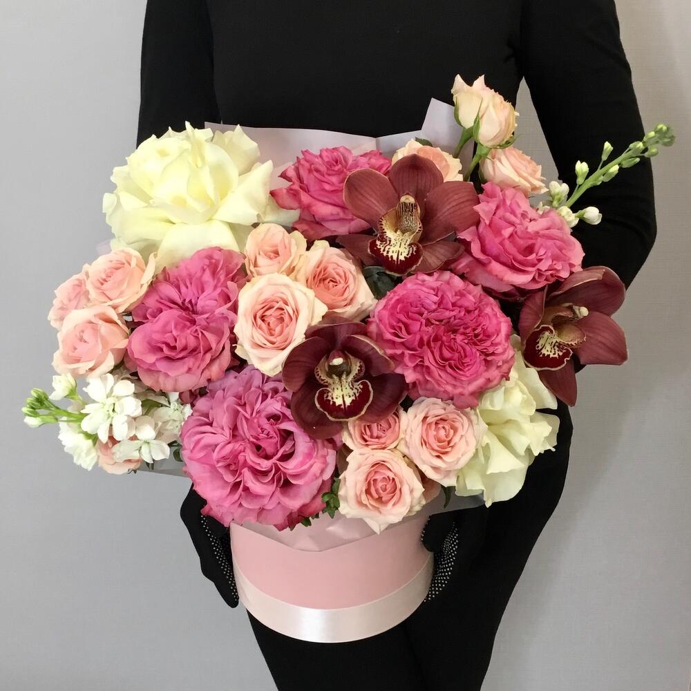 Маттиола – 2 шт.Кустовая роза – 4 шт.Зелень – 3 шт.Лента атласная – 1 шт.ЦИМБИДИУМ – 3 шт.Французская роза – 2 шт.Пленка матовая – 1 шт.Оазис флористический – 2 шт.пионовидная роза кантри блю – 5 шт.шляпная коробка 18 см – 1 шт.