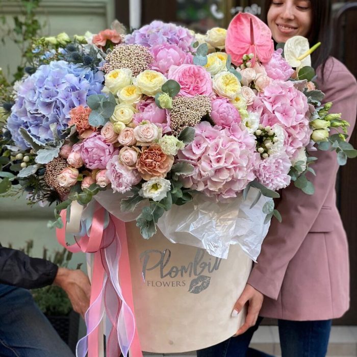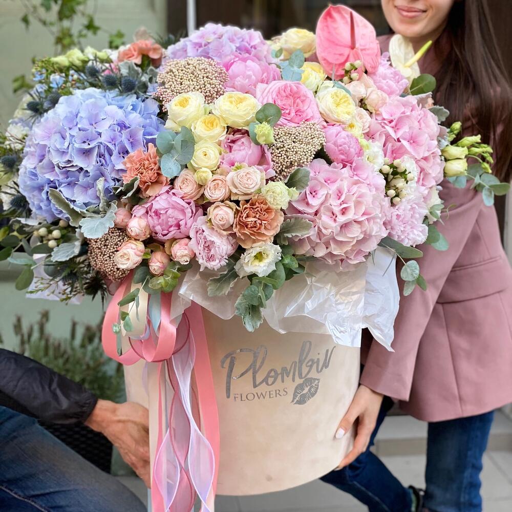 Коробка шляпная – 1 шт.Оазис флористический – 10 шт.Гортензия – 5 шт.Роза пионовидная – 10 шт.Кустовая роза – 10 шт.Пион – 5 шт.Хризантема кустовая – 5 шт.Диантус – 10 шт.Дельфиниум – 5 шт.Эустома – 10 шт.Зелень – 10 шт.сухоц – 5 шт.