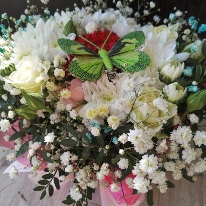 Гипсофила – 1 шт.Роза кустовая – 1 шт.Хризантема кустовая – 1 шт.Упаковка – 1 шт.Диантус – 1 шт.Фисташка – 2 шт.Бабочка декоративная – 1 шт.