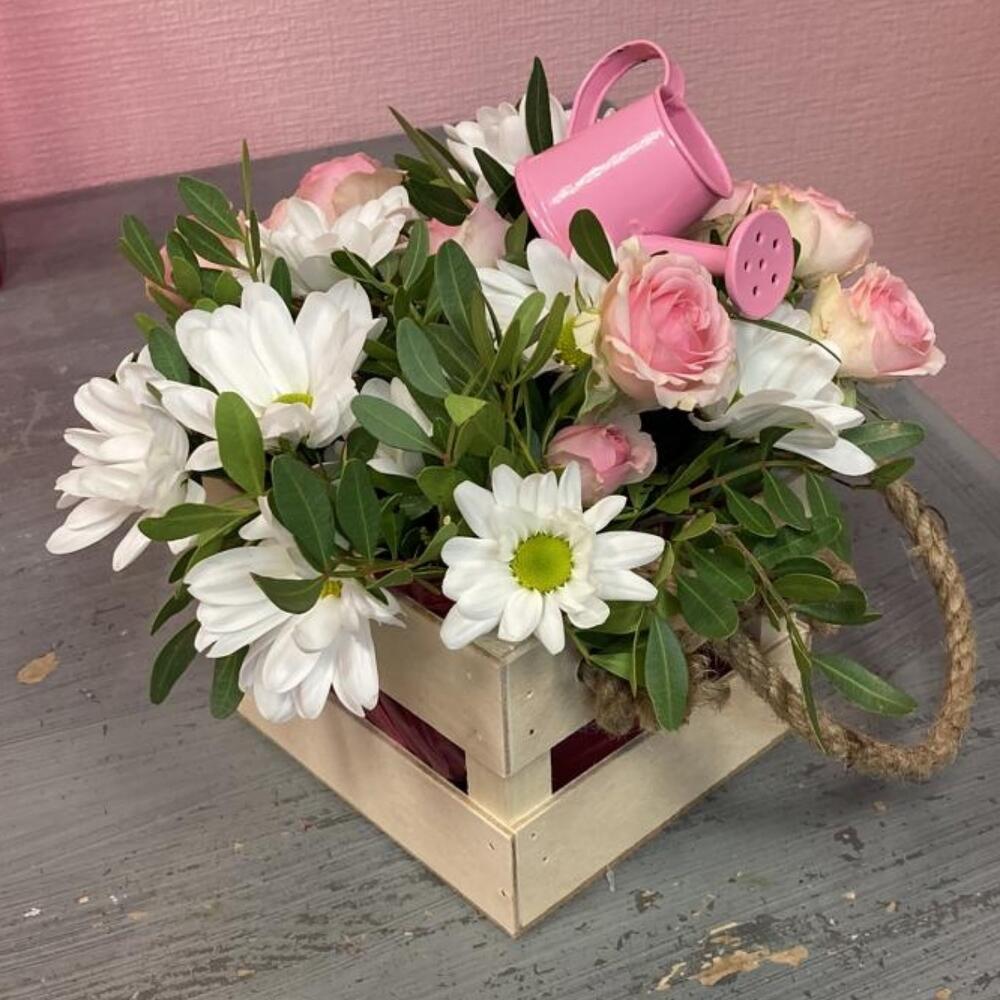 Роза кустовая – 2 шт.Хризантема кустовая – 2 шт.Фисташка – 1 шт.Оазис флористический – 1 унц.Ящик деревянный – 1 шт.Лейка металлическая – 1 шт.