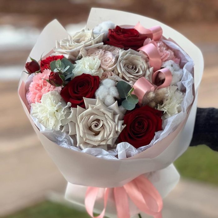 Роза красная – 3 шт.Роза кустовая – 1 шт.Эвкалипт – 1 шт.Роза пионовидная – 1 шт.Гвоздика сортовая – 5 шт.Упаковка дизайнерская – 1 шт.Кризал (подкормка) – 1 шт.Хлопок натуральный – 3 шт.Роза серая – 3 шт.Лагурус (сухоцвет) – 3 шт.