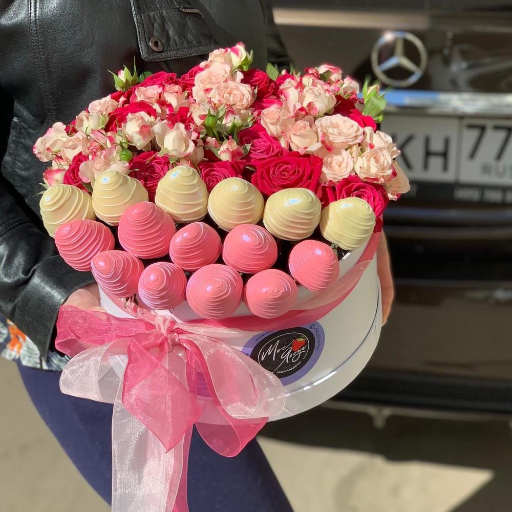 Коробка с клубникой в бельгийском шоколаде и розами