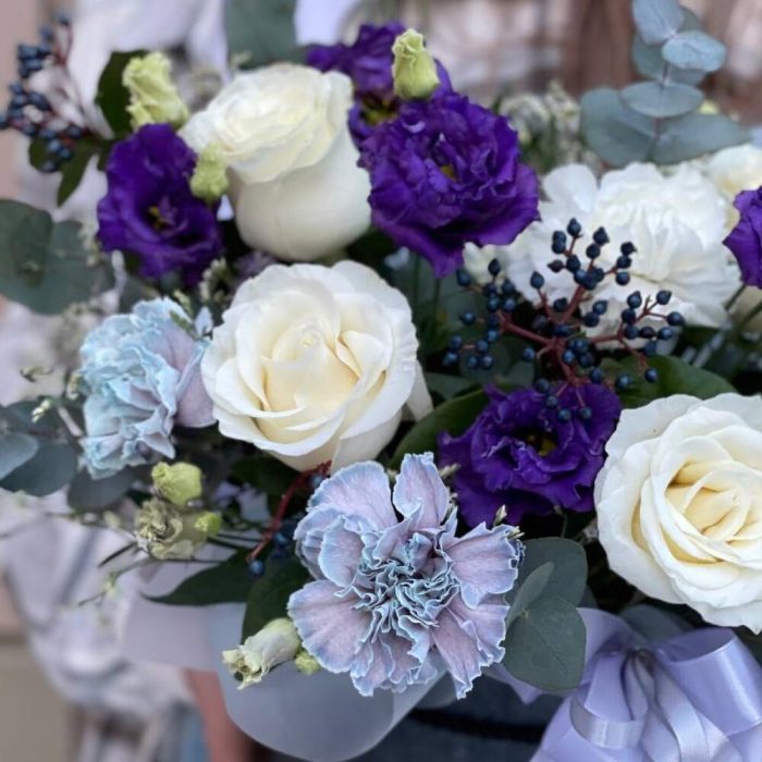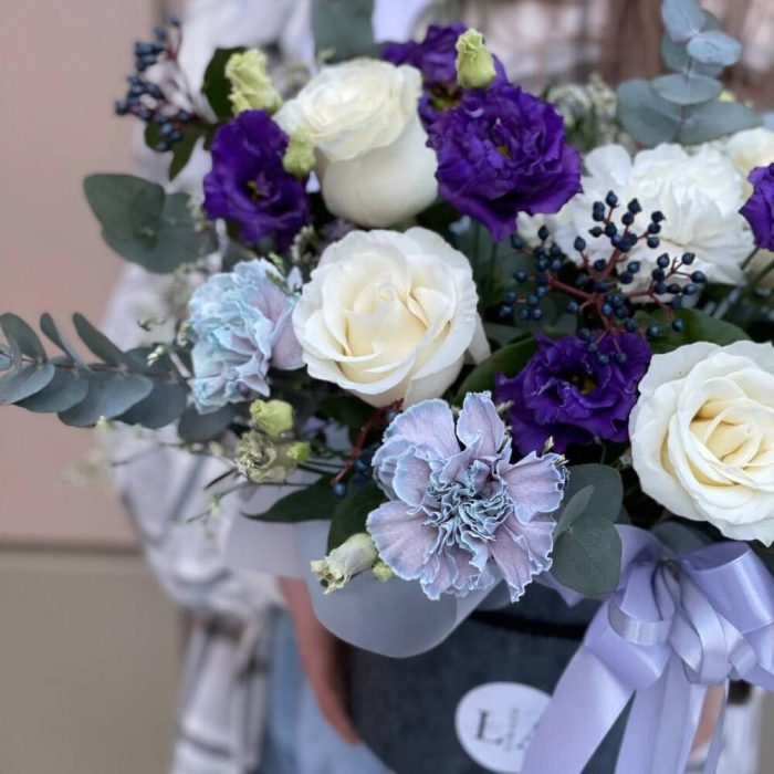 Вибурнум – 3 шт.Эвкалипт – 3 шт.Роза Эквадор – 6 шт.Эустома – 2 шт.Гвоздика белая – 3 шт.Шляпная коробка – 1 шт.Оазис флористический – 1 шт.гвоздика крашенная – 5 шт.