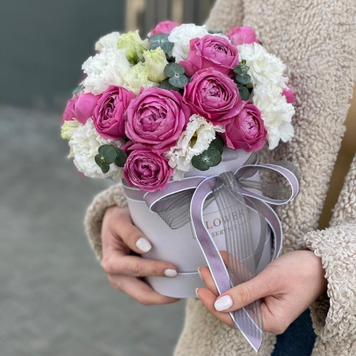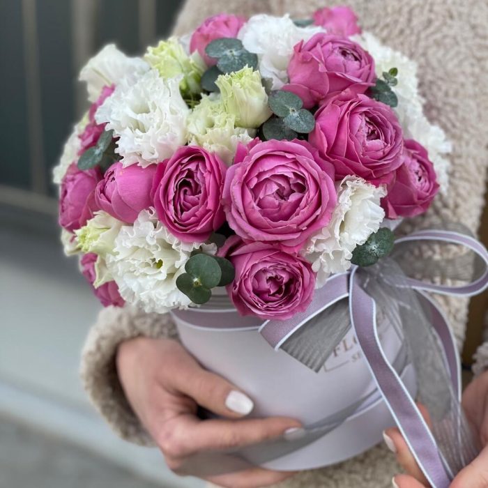 Коробка Трогательные чувства из эустомы и пионовидных роз