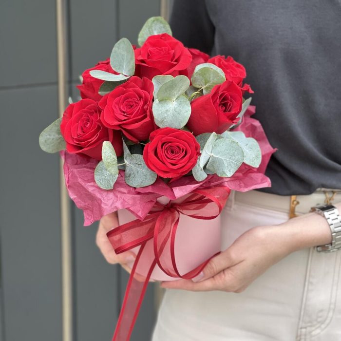Коробочка с красными розами и эвкалиптом!