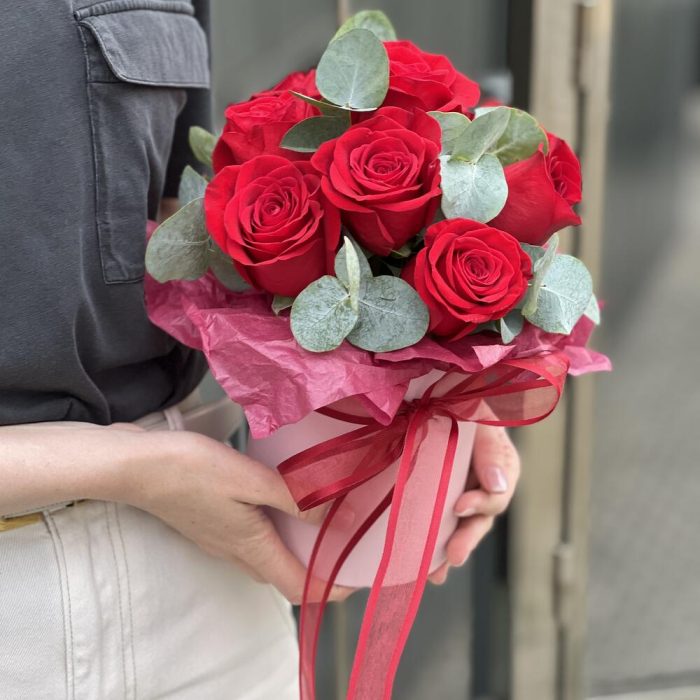 Роза красная – 9 шт. Эвкалипт – 1 шт. Оазис – 1 шт. Коробка – 1 шт. Оформление – 1 шт.