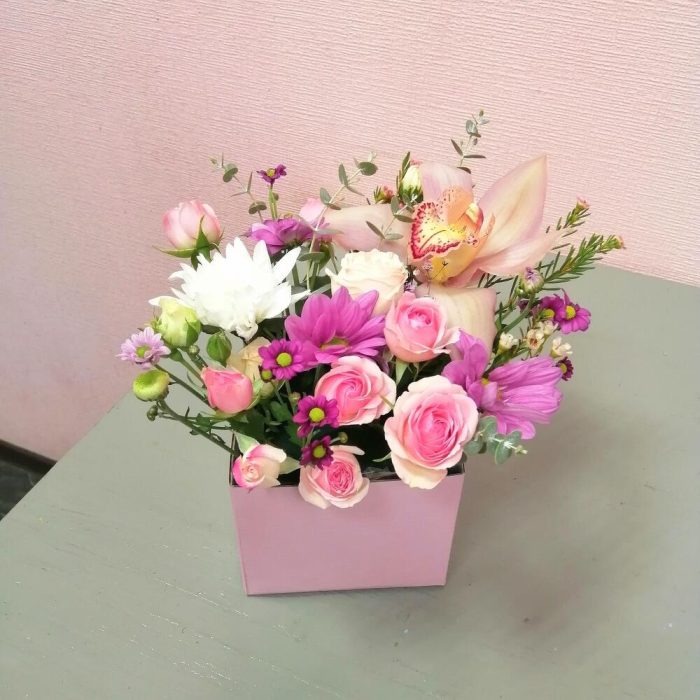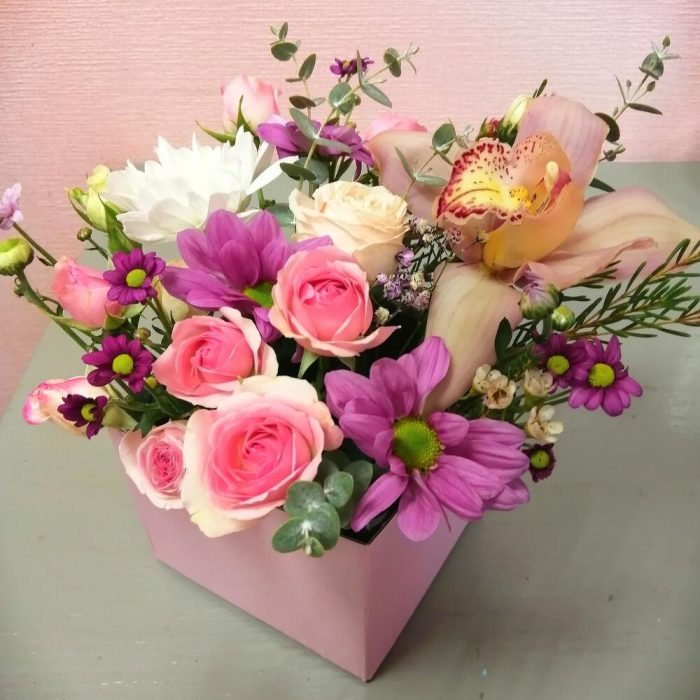 орхидея колокольчик – 1 шт.Роза кустовая – 1 шт.Хризантема кустовая – 1 шт.Ваксфлауэр – 1 шт.Оазис флористический – 1 шт.Коробка прямоугольная – 1 шт.Эвкалипт – 1 шт.