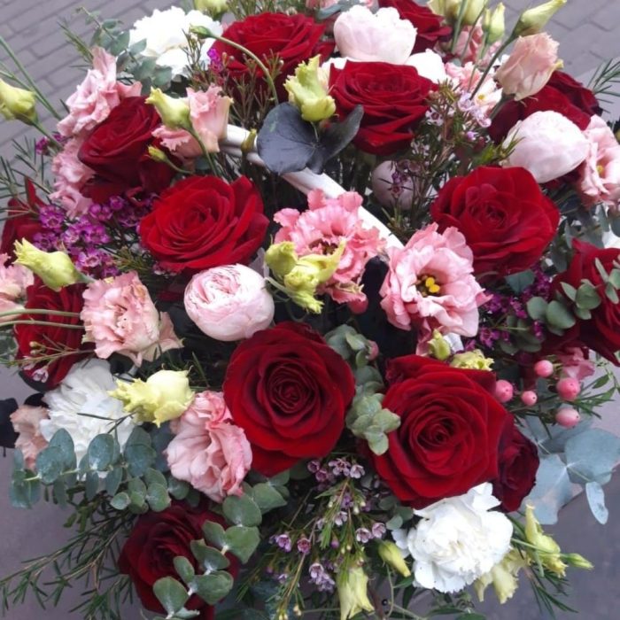 Эвкалипт – 10 шт.Роза – 15 шт.Кустовая роза – 5 шт.Гвоздика – 5 шт.Эустома – 8 шт.впксфлауэр – 5 шт.