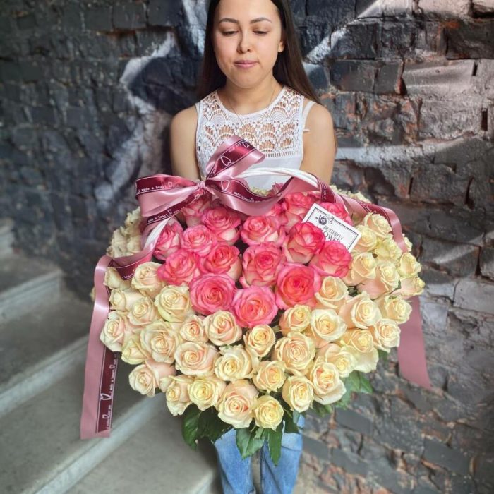 Корзина – 1 шт.Оазис – 3 шт.Роза – 101 шт.Лента – 2 шт.