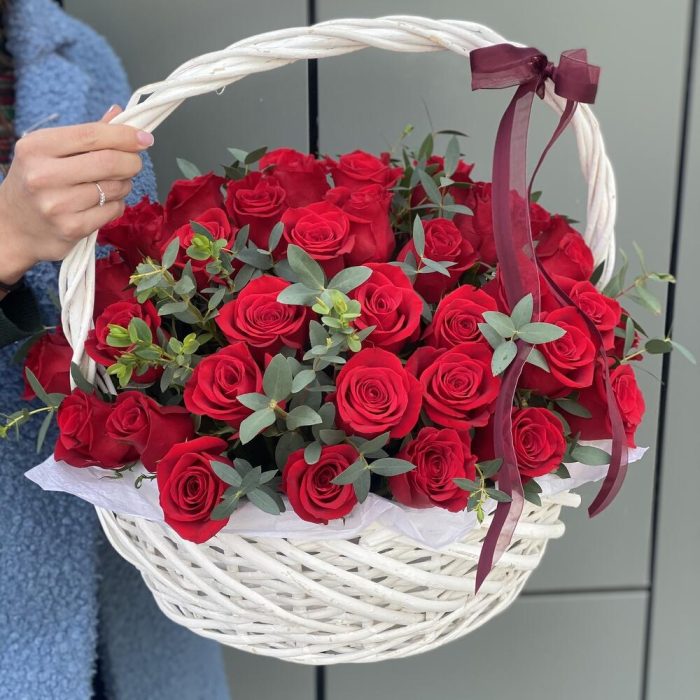 Метки: 14 февраля, 51 роза, от 5000 руб, Роза 30 см, Розы в корзине, цветы в корзине